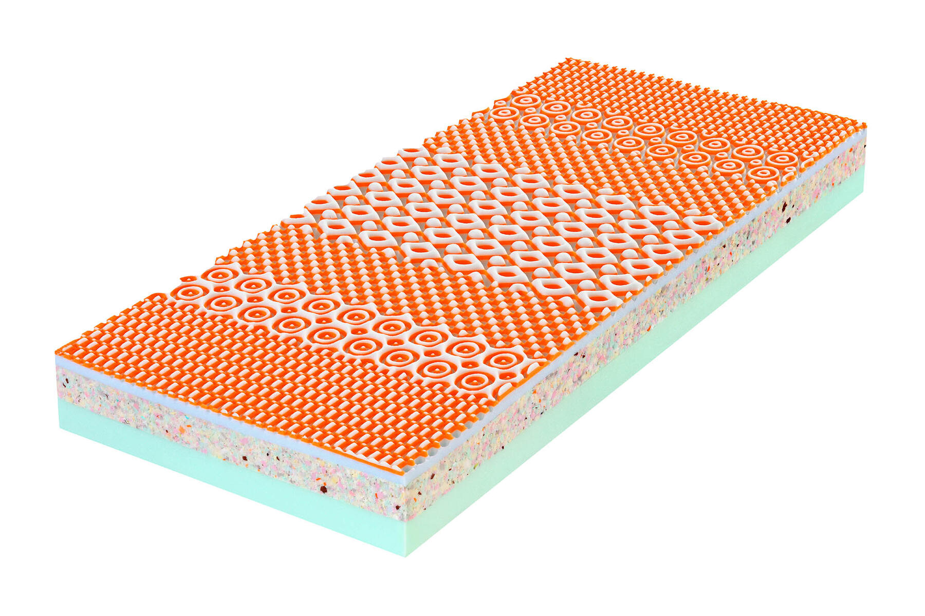 Flexifoam® (strana hard). Pružná, ale tužší strana nabízí 7 anatomických zón s jemným masážním účinkem pro uvolnění napjatého svalstva a podporu správného krevního oběhu v průběhu spánku, což je u tuhé matrace obzvlášť důležité.