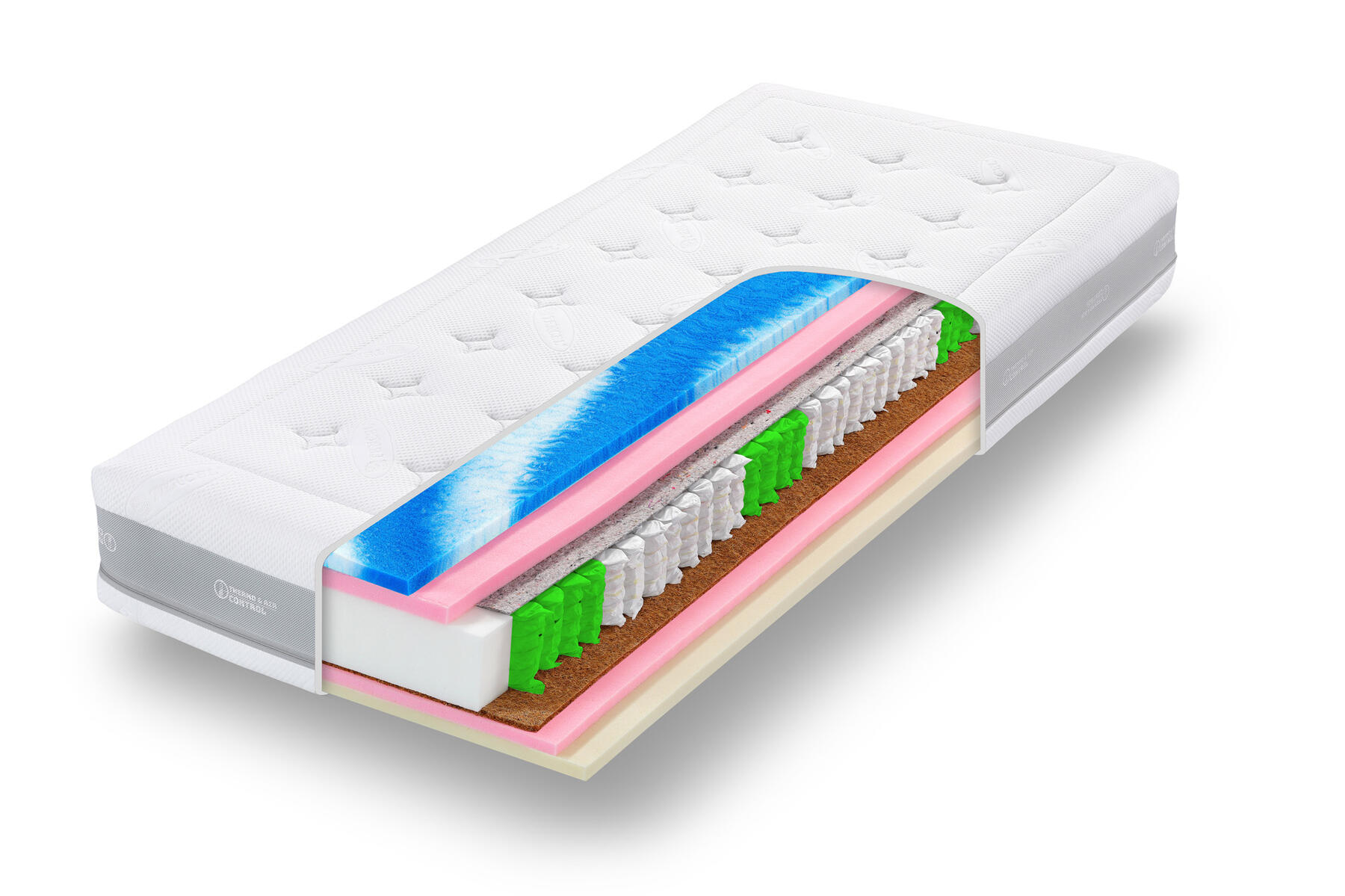 · Hybridní pěna GelTouch (strana soft). Spojuje hebkost latexu s dokonalou distribucí tlaku gelových matrací. Vysoce prodyšná, napomáhá správné termoregulaci.