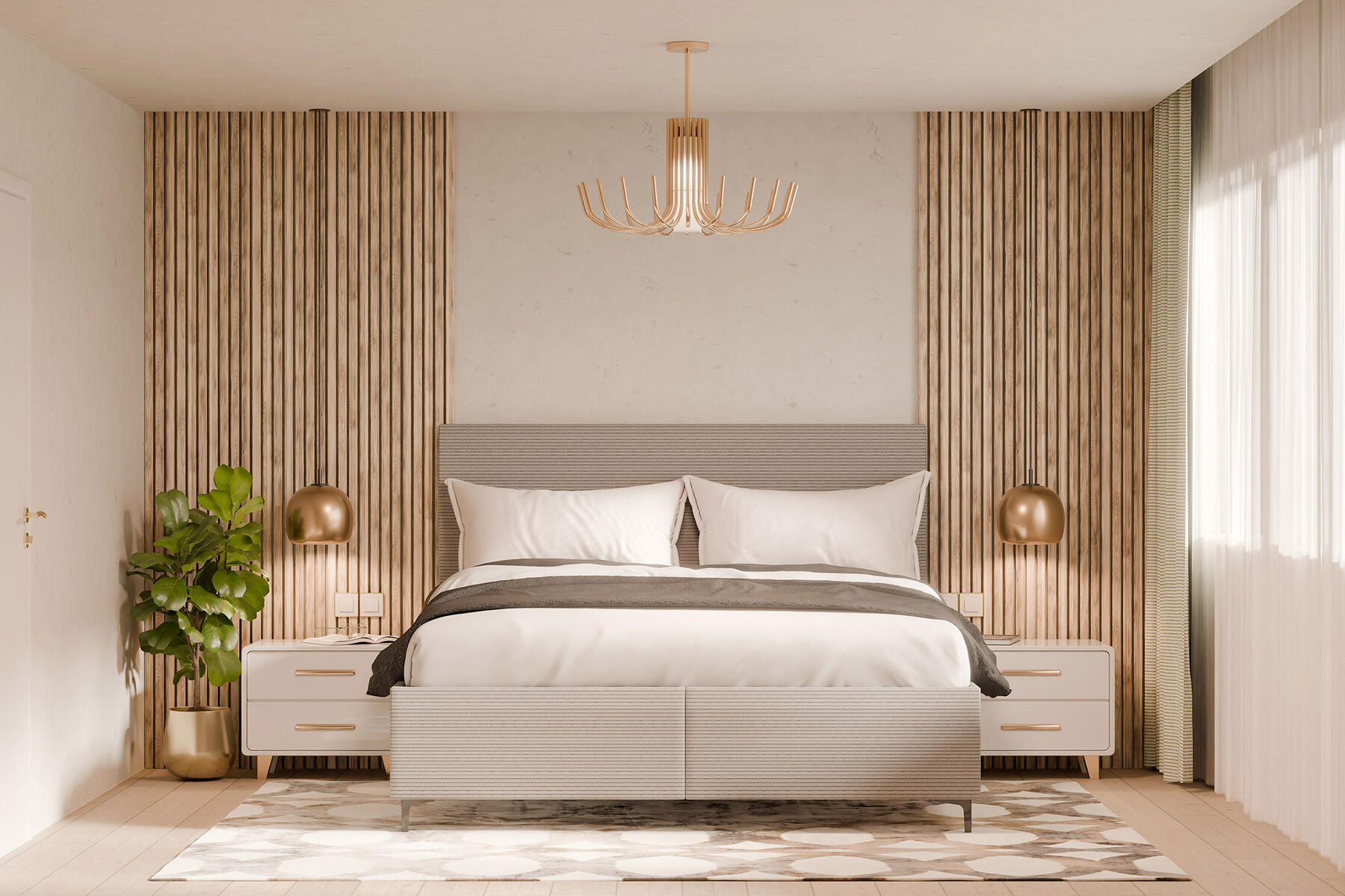 Postel s čalouněnou základnou ve tvaru boxu je pevná a vybavená odvětrávanými úložnými prostory.