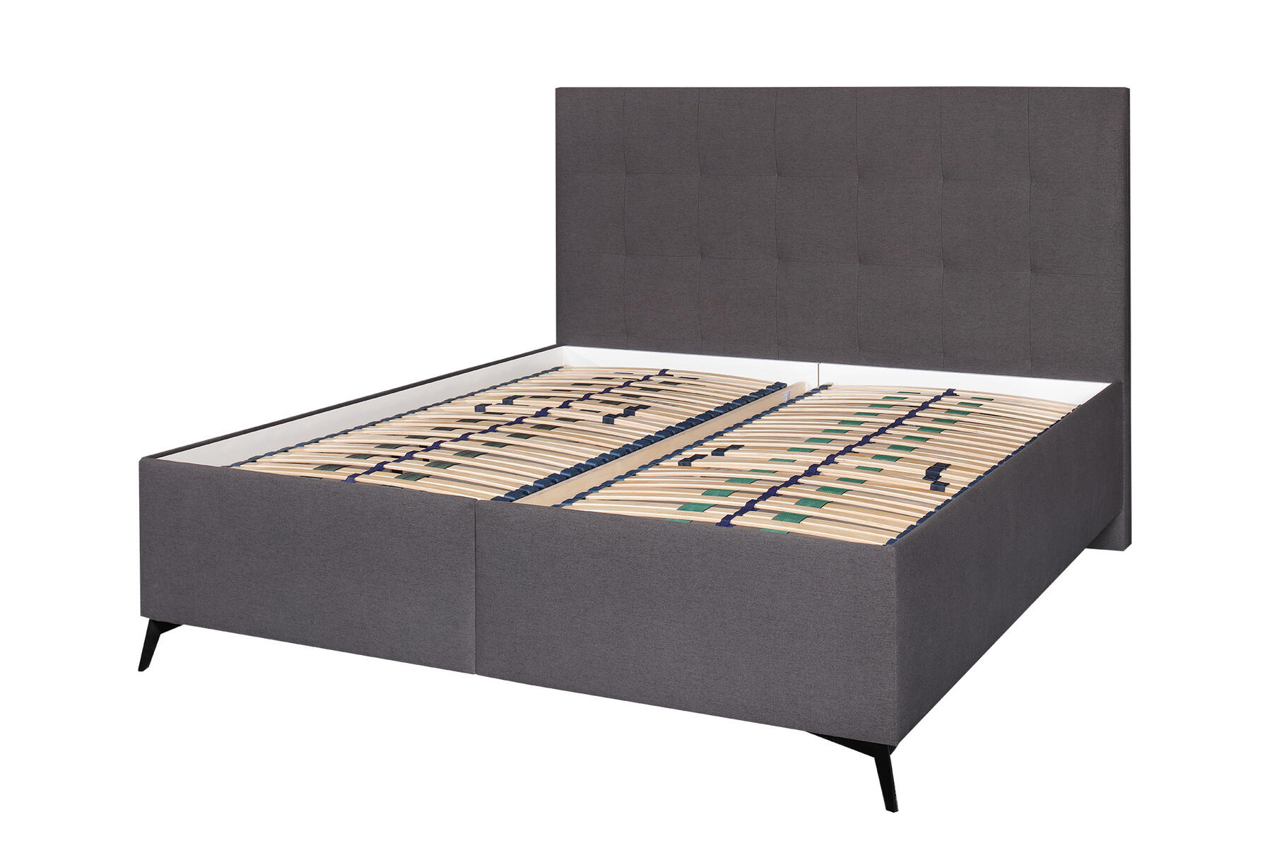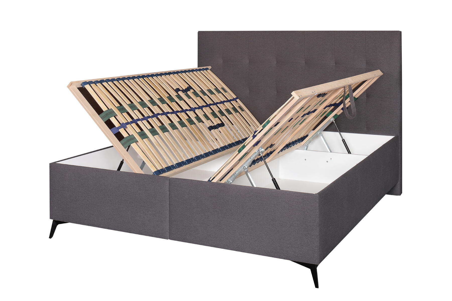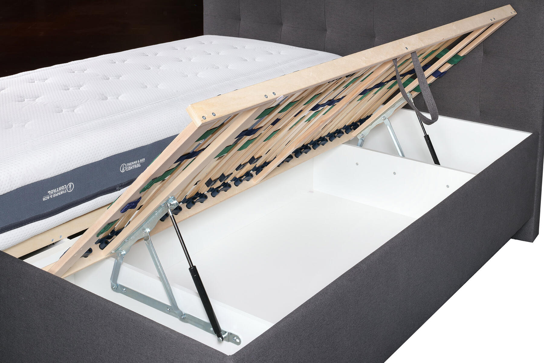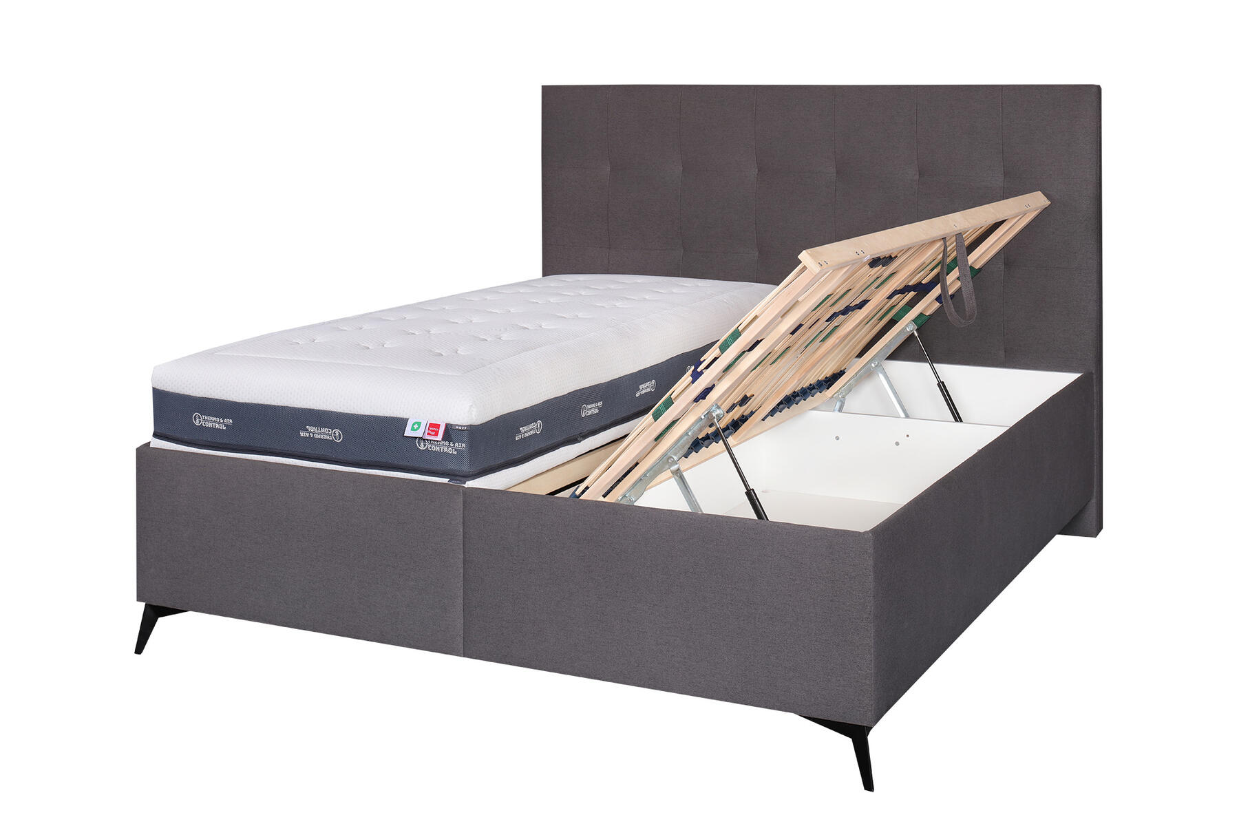 Je vhodná pro použití s jakýmikoli matracemi, přičemž výška matrace určuje konečnou výšku ložné plochy. Úložné prostory jsou snadno přístupné díky vyklápěcím mechanismům s plynovými vzpěrami a bočnímu výklopu roštů. Vysoké nožičky zajišťují, že postel není přímo na zemi, což umožňuje správné proudění vzduchu pod postelí a chrání vás před průvanem. Čelo postele a potahovou látku si můžete vybrat podle svého vkusu nebo designu vaší ložnice. Postel je vybavena dvěma designovými nožičkami a dvěma kovovými nožičkami, které slouží jako spojnice boxů na vnitřní straně a nejsou viditelné z vnějšího pohledu. Boxy jsou pevně přišroubovány, což zabraňuje jakémukoli posunu.