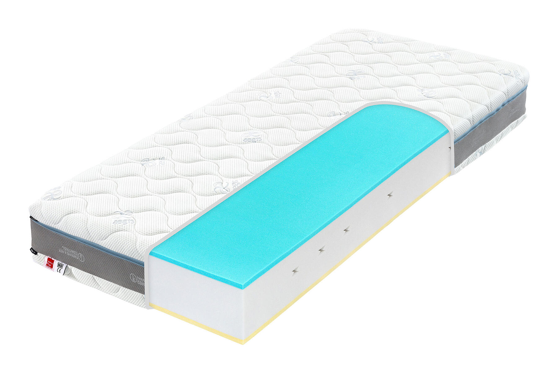 • Paměťová pěna (strana hard) Paměťová pěna znamená pohodlí a odlehčení pohybového ústrojí. Poskytuje relaxaci znavenému tělu, odlehčuje klouby a uvolňuje svaly. Svojí vynikající schopností kopírovat kontury těla pomáhá udržet páteř v optimální poloze.